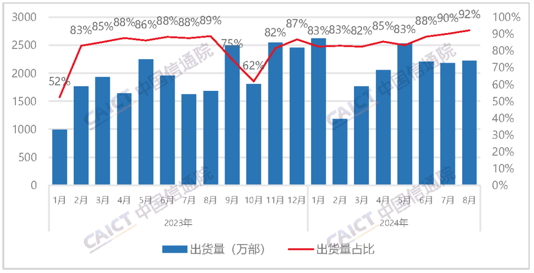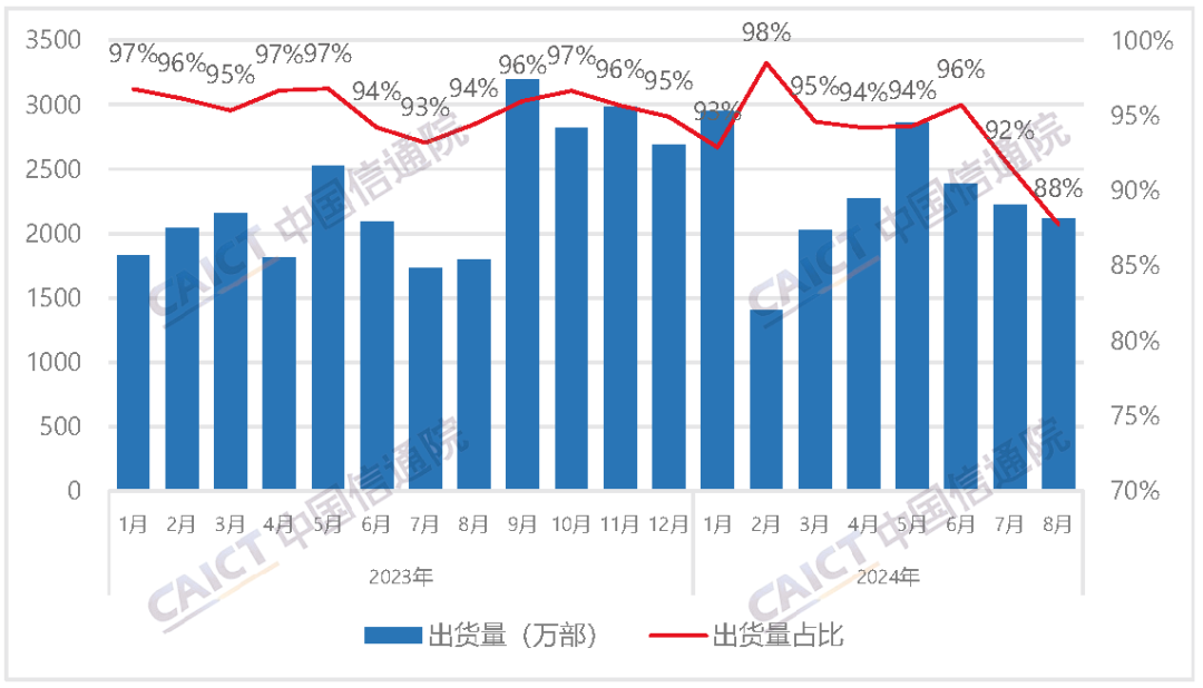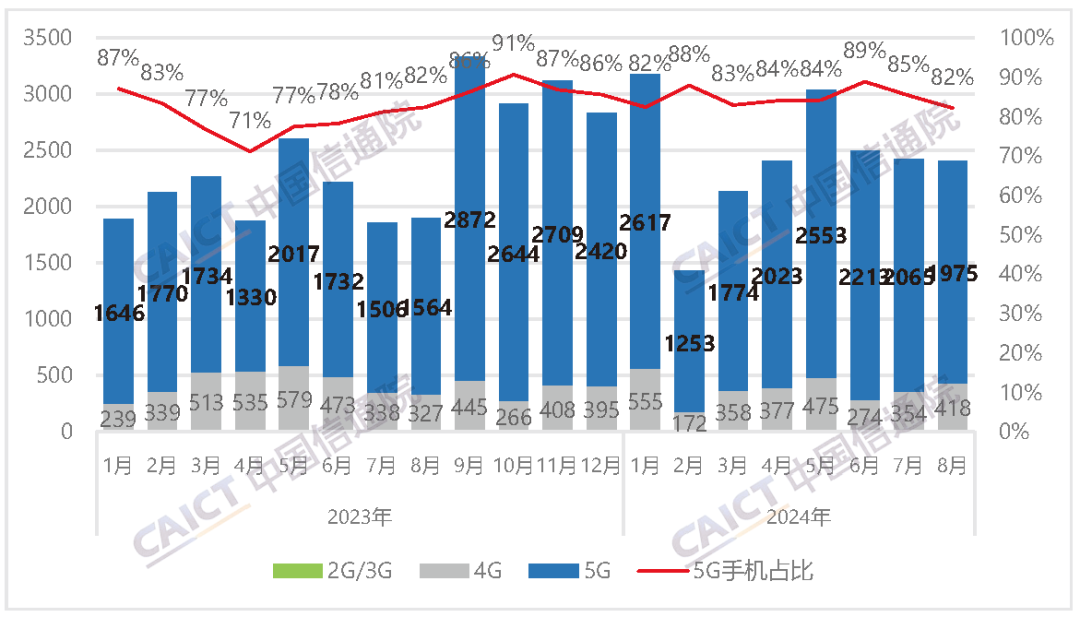 2024 年 8 月,国内市场手机出货量 2404.7 万部,同比增长 26.7%,其中,5G 手机 1975.4 万部,同比增长 26.3%,占同期手机出货量的 82.1%。