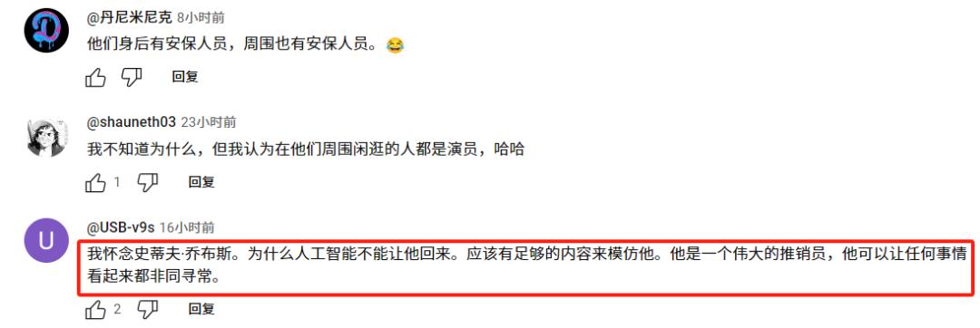 在综艺节目中,库克表示,他会不停地提醒自己,人们只是喜欢苹果公司,他只是恰好坐在那个接受人们热情的位置上。但从网友的反应来看,人们对库克带领苹果公司近些年的表现多少有些丧失信心,甚至更希望苹果通过AI让乔布斯来介绍产品。