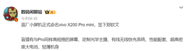 博主还表示,vivo X200 Pro min是大杯的小屏版,盲猜有与Pro同样高规格的屏幕、定制光学主摄、有线无线快充系统、性能配套、超高密度大电池、轻薄机身。