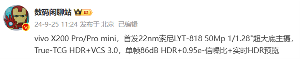 此外,博主数码闲聊站透露,vivo X200 Pro mini将首发 22nm索尼LYT-818 50Mp 1/1.28"超大底主摄,支持True-TCG HDR+VCS 3.0,拥有单帧86dB HDR+0.95e-信噪比,以及实时HDR预览。