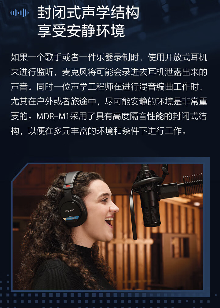 索尼官方表示,MDR-M1 耳机“集录音室音质、极致舒适和可靠性于一身”,适用于各种音乐制作和高分辨率音频应用。其采用具有高隔音性能的封闭式声学结构、独家开发的驱动器以及轻巧舒适的设计,让用户能够沉浸在自己的环境中进行创作,如同在录音室中一样。