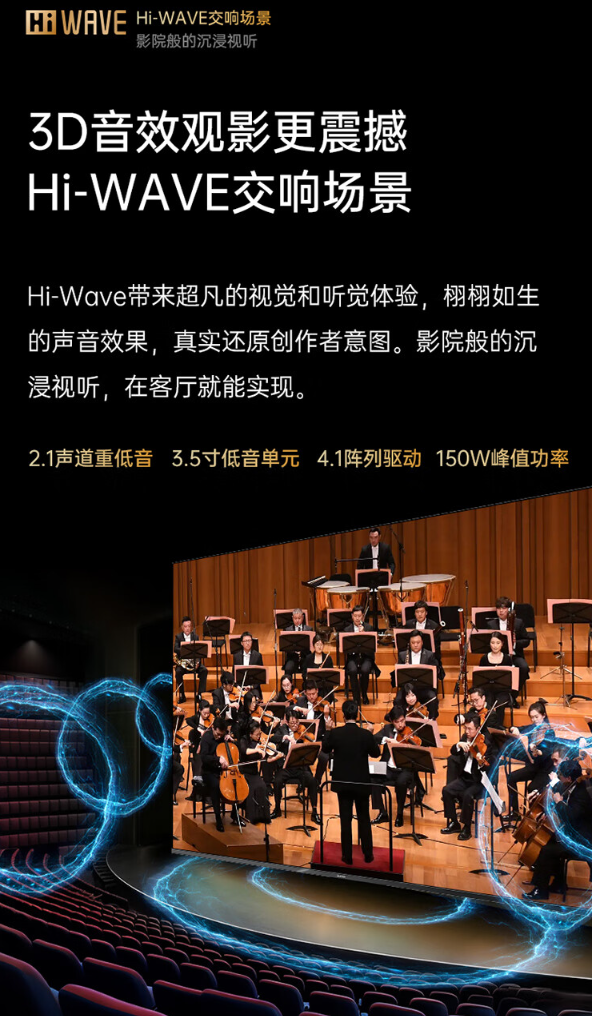 该款电视覆盖 93% DCI-P3 色域,预装“沧海智能体”、魔方智慧桌面,可自由编辑桌面显示内容;长虹 D7H Mini 内置 Hi-Wave 交响场景,拥有 3.5 寸低音单元、4.1 阵列驱动,支持 150W 峰值功率。