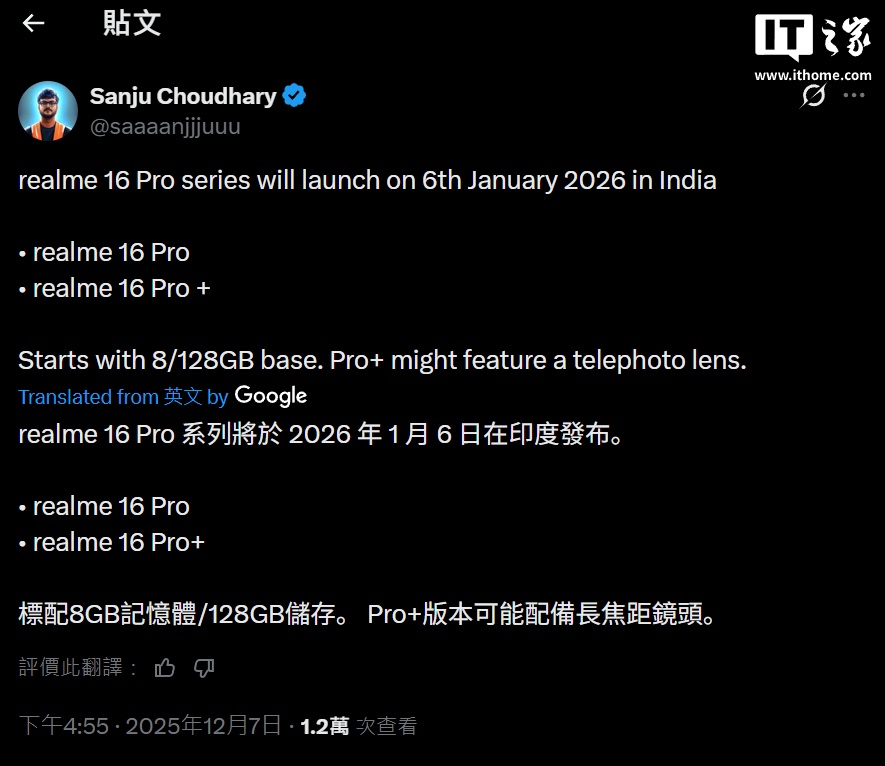 IT之家 12 月 9 日消息,消息人士 Sanju Choudhary 前天在 X 平台发文称,realme 真我 16 Pro 系列手机将于 2026 年 1 月 6 日在印度发布,有望推出 Pro 和 Pro+ 两种型号。