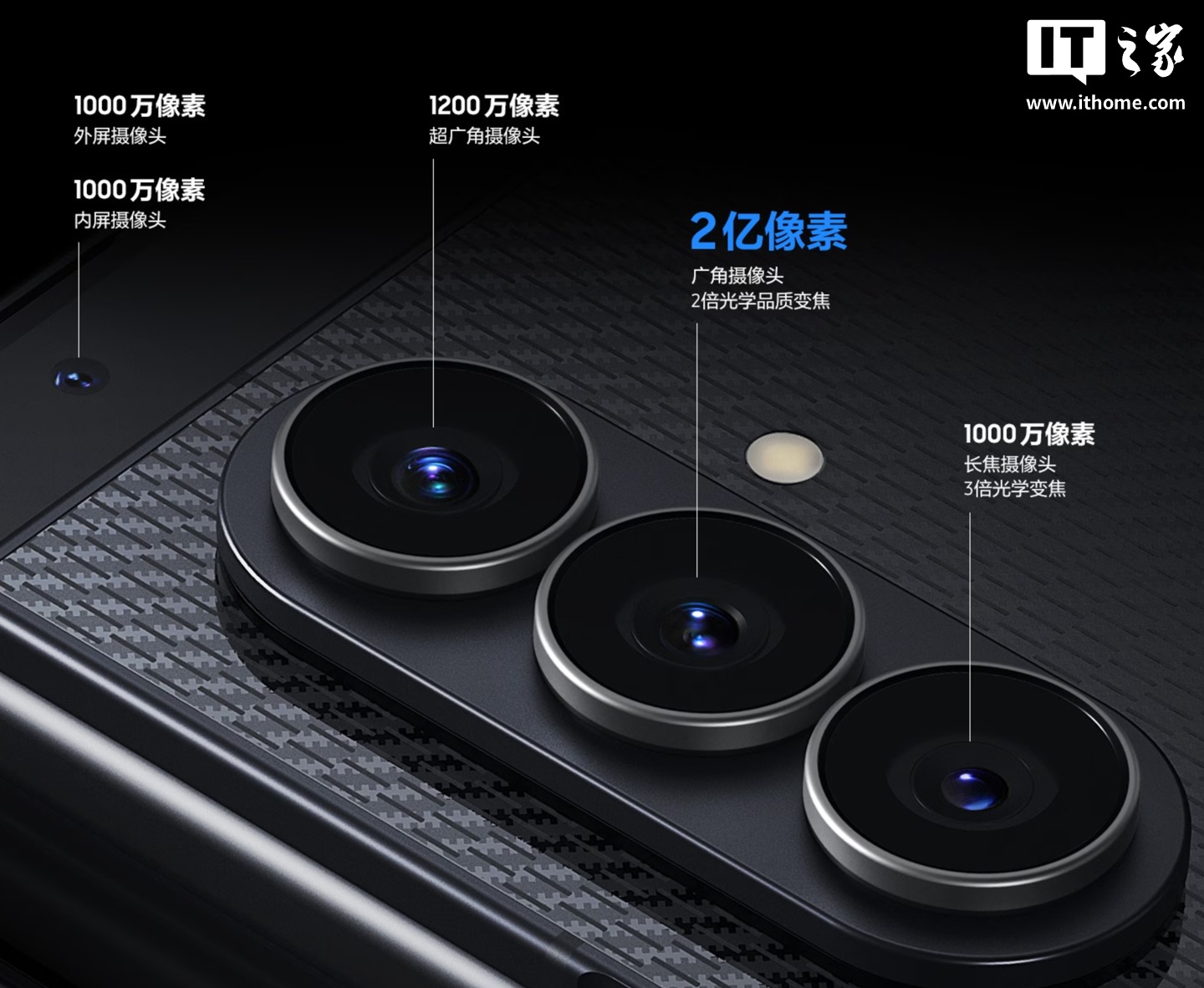 影像方面,Galaxy Z TriFold 手机搭载 2 亿像素主摄,可实现 2 倍光学品质变焦,辅以 1200 万像素超广角镜头、1000 万像素 3 倍光学变焦长焦摄像头,外屏和内屏的前摄均是 1000 万像素。