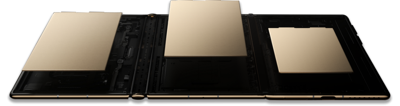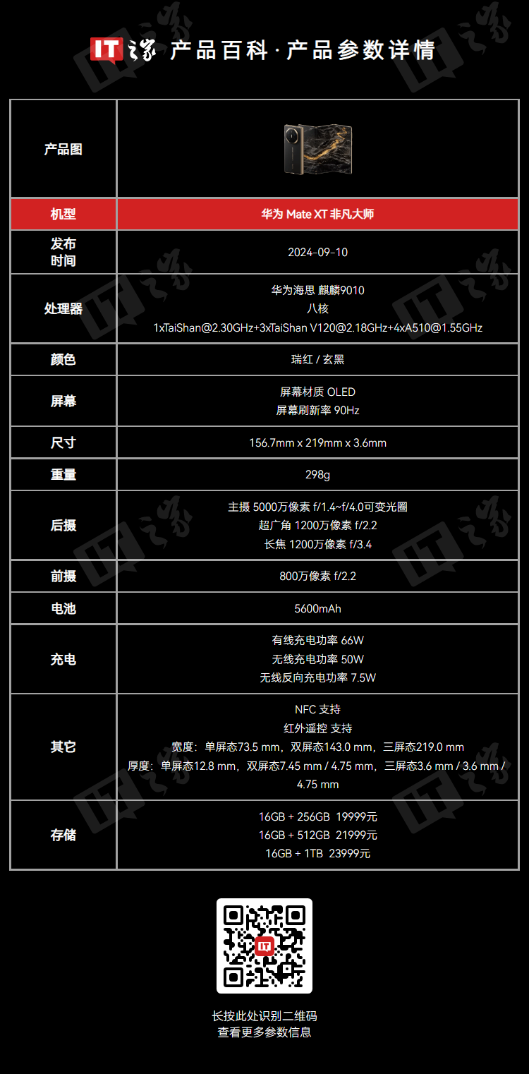 驱动这块三折叠屏的便是麒麟 9010 处理器,这台手机共提供 16GB + 256GB、16GB + 512GB 和 16GB + 1TB 三个存储版本。