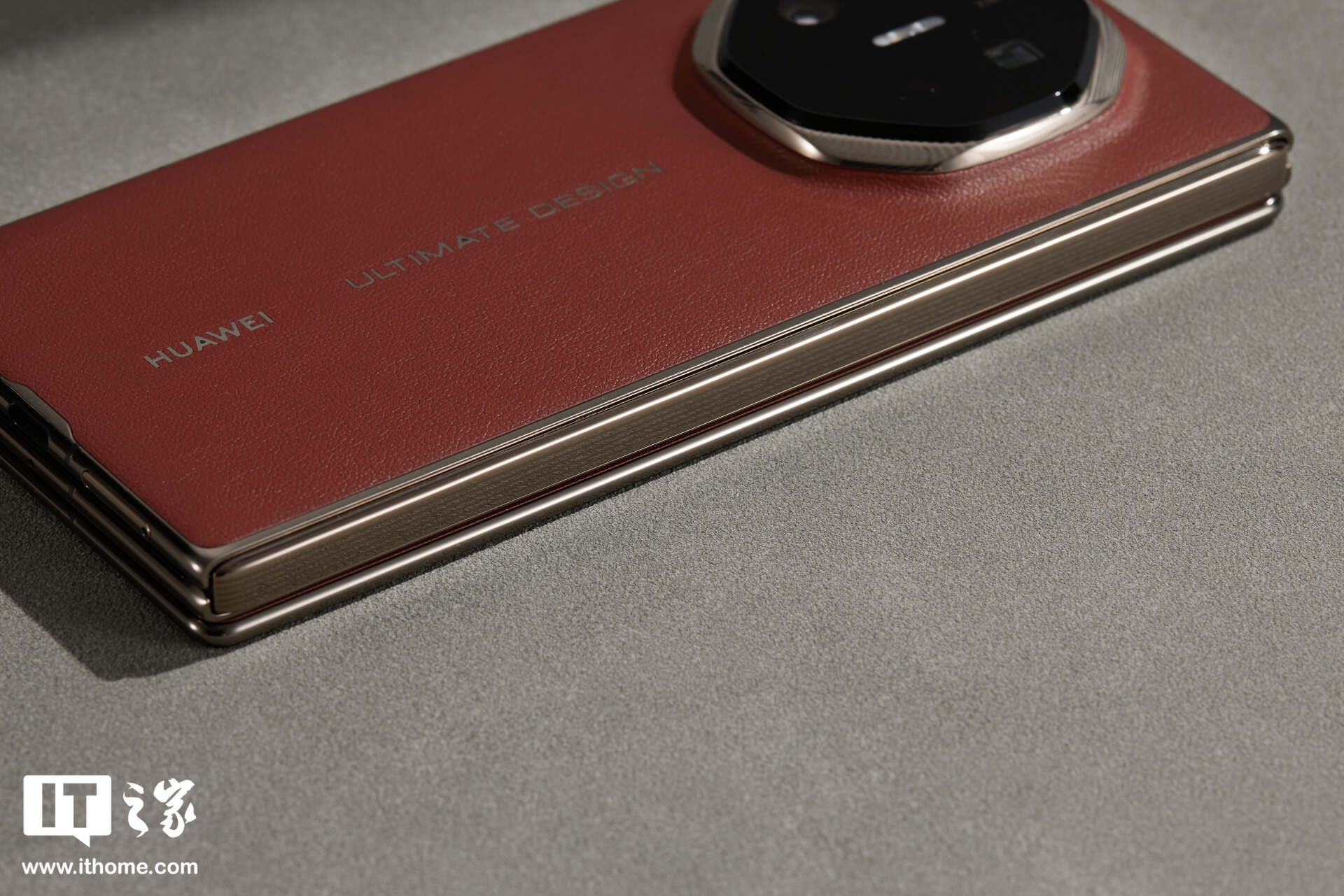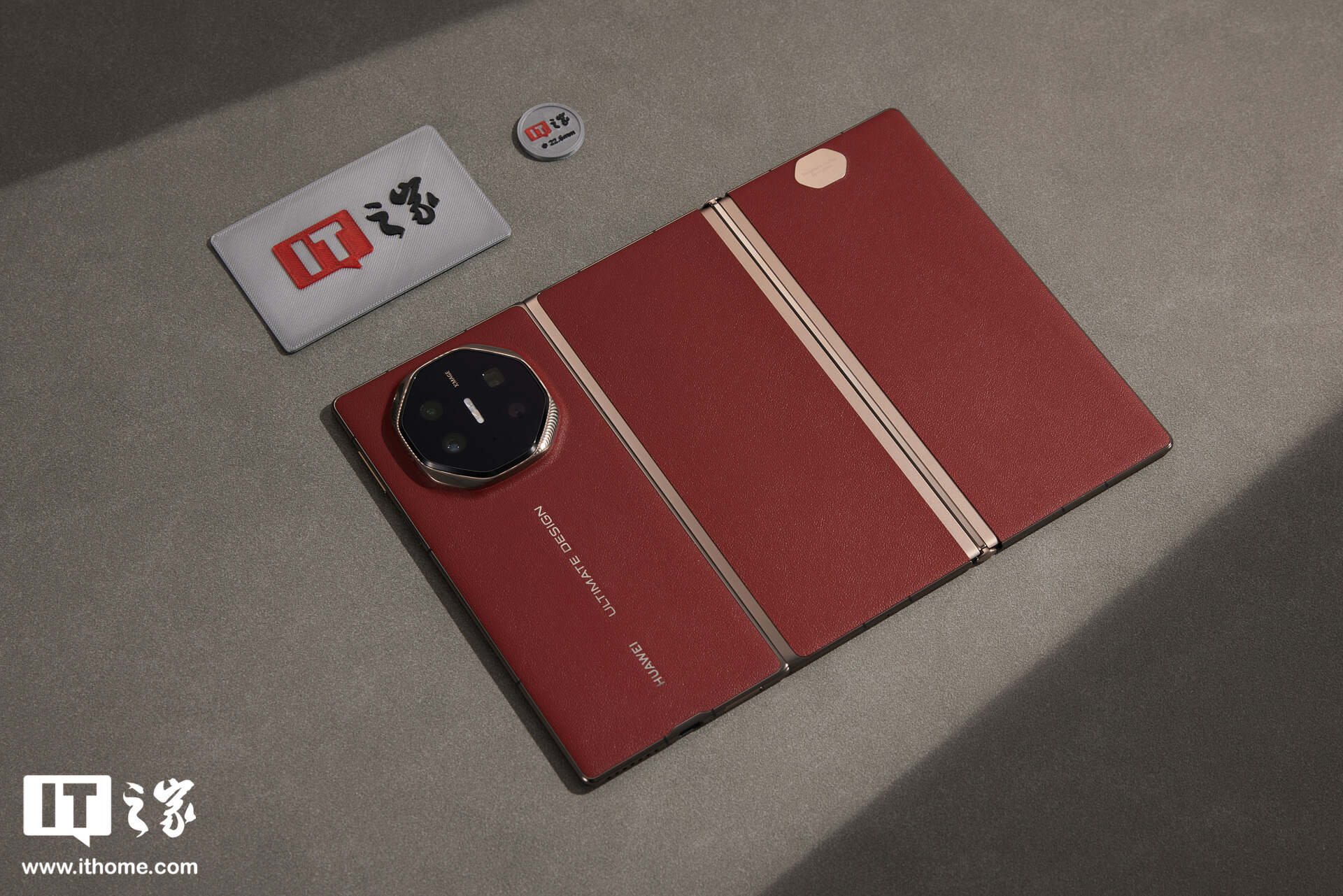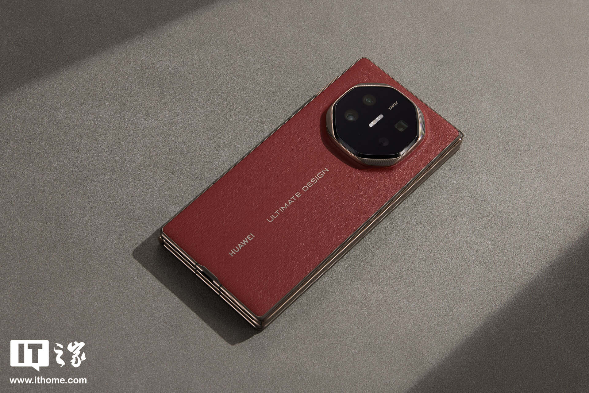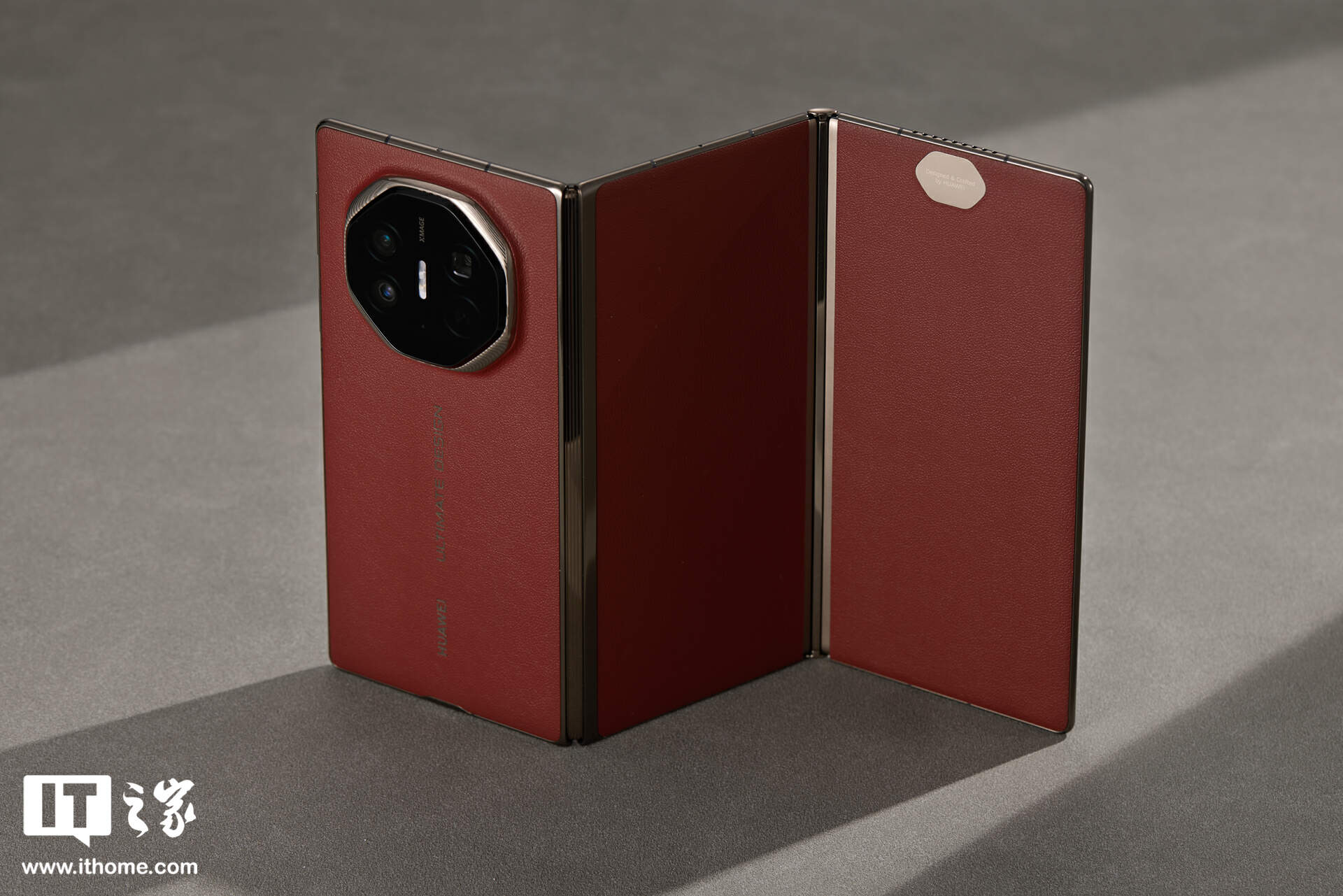华为 Mate XT 非凡大师提供瑞红与玄黑两款配色,采用新材质的超薄素皮与乌金腰线设计,手机展开后还可以看到“Designed & Crafted by HUAWEI”徽标。