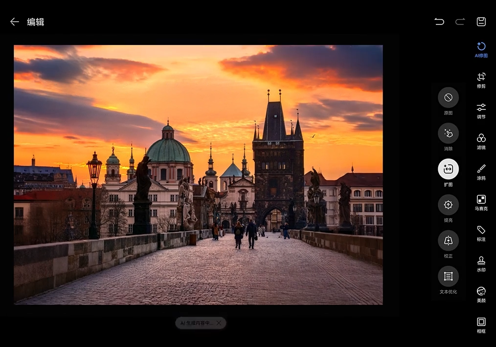 此外,华为的 AI 修图功能也十分强大,除了支持 AI 消除、AI 云增强等修图功能,还可以根据对图片内容和结构的理解,智能生成图片的扩展区域,实现 AI 扩图。