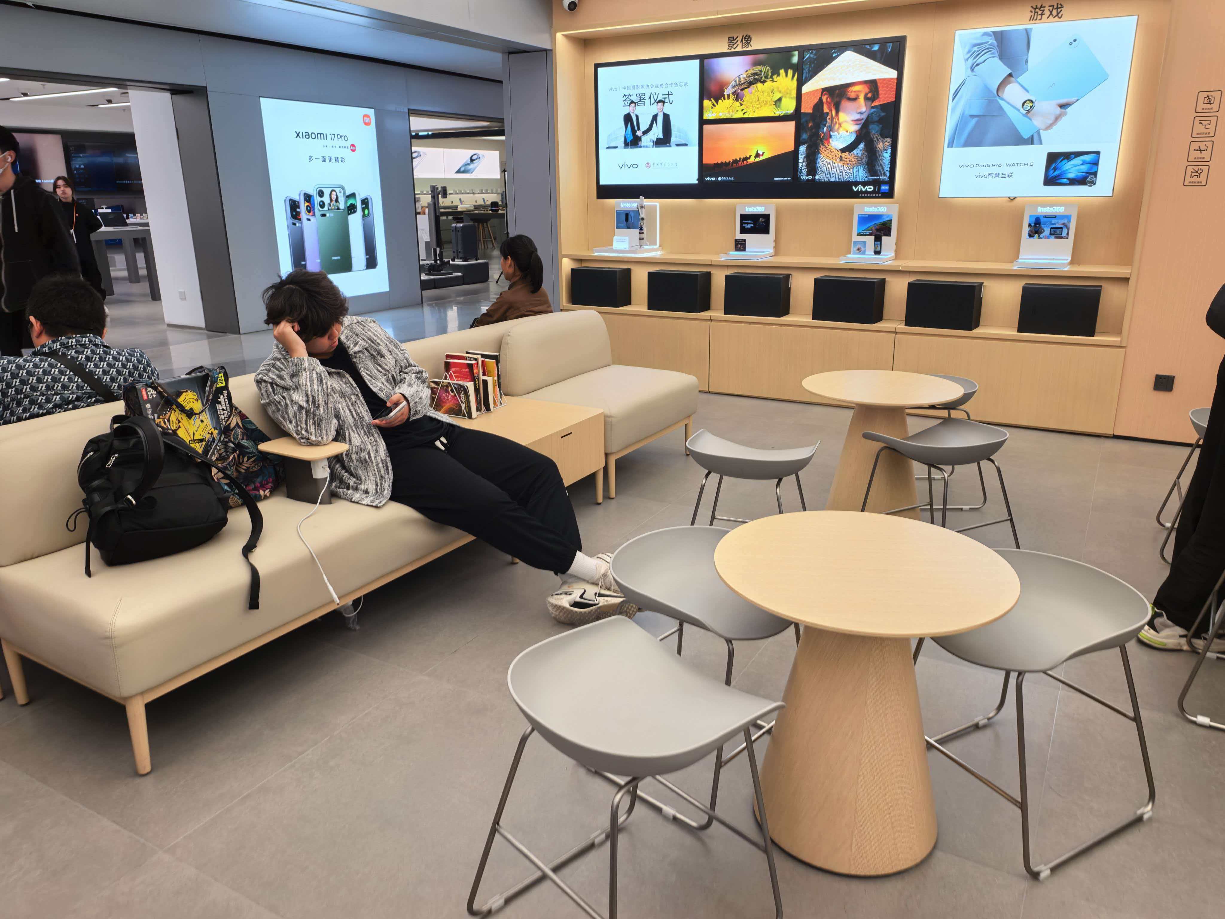 另一旁的桌子上,一位中年女性正在体验vivo Vision,旁边的店员耐心为她介绍各个功能。但很可惜的是,当天已经没有体验名额了。我们还注意到,vivo门店虽然比较小一些,但除了手机展示区、售后服务中心,vivo Vision的体验区外,还增加了一张长条型沙发,配有插口,所有顾客都可以在这里歇一歇脚,充充电。