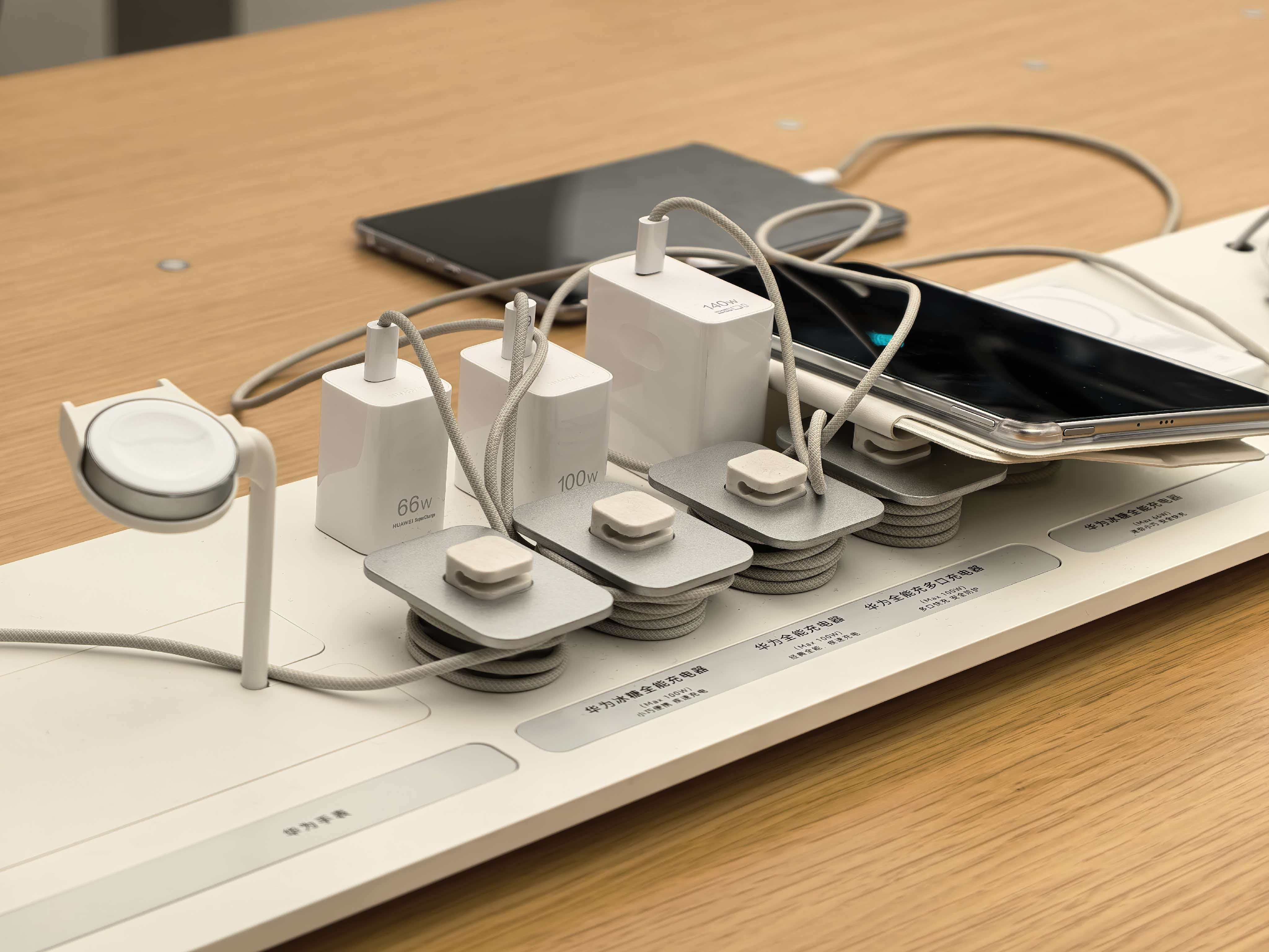我们进一步询问资料传输、贴膜等服务时,店员也给出非常清晰的说明。贴膜服务并不是免费,按照会员等级一年有固定的次数,用完之后就需要收费,一张99元,其实有一点偏贵,但店员表示到店贴膜的顾客并不算多,花钱贴这种水凝膜的更是少之又少。充电服务做得非常到位不仅可以免费充电,而且提供66W、100W、140W三种规格的快充充电头和线,甚至还准备了华为手表的专用充电座,是我们此次走访中看到配置最齐全充电区。