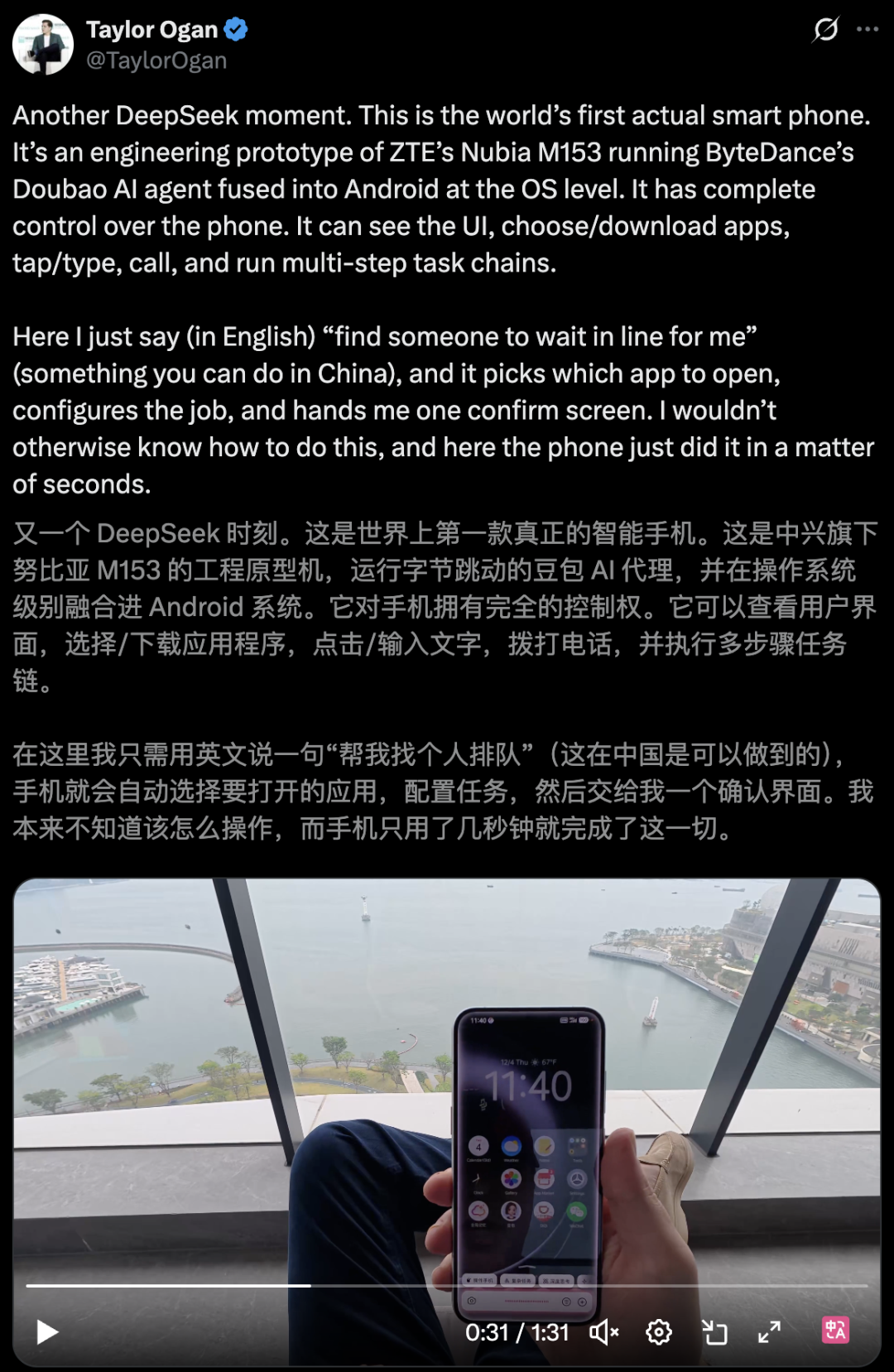 海外创业大佬Taylor Ogan惊呼,「这简直是另一个DeepSeek时刻!这是世界上第一款真正的智能手机」。