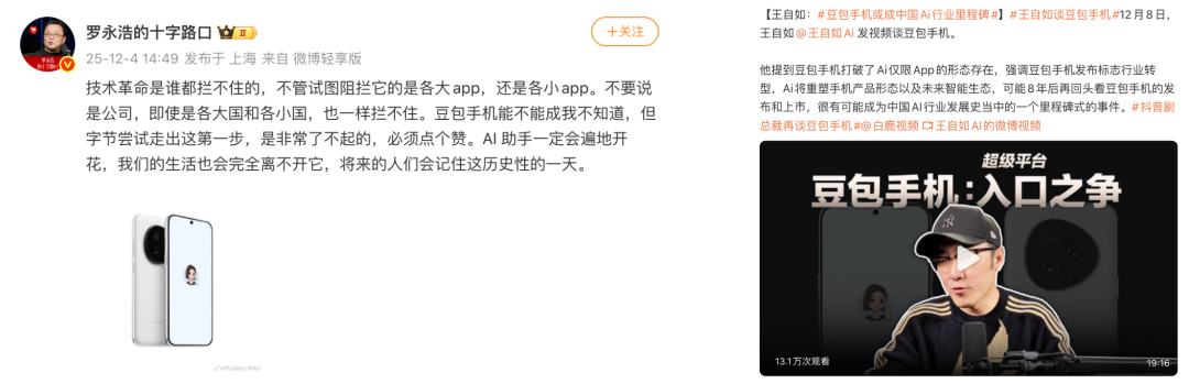 昔日针锋相对的宿敌,老罗和王自如在「豆包手机」上,立场罕见地一致。