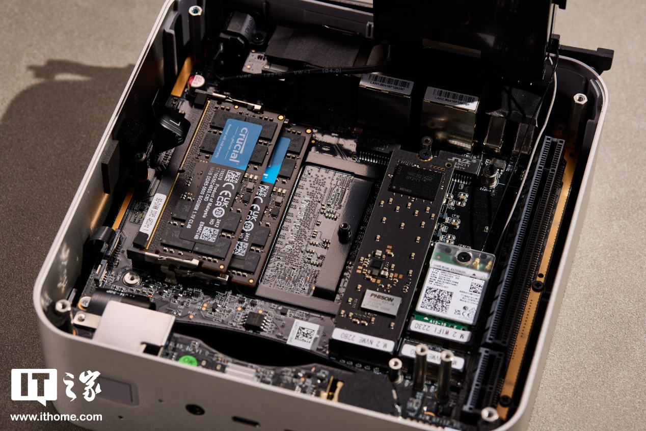 取下盖板,就能看到零刻 GTi12 UItra 的内存与硬盘,我们手中这台主机配置为 32G 内存 + 1TB 硬盘版本,大家也可以购买准系统版本自行安装内存与硬盘。