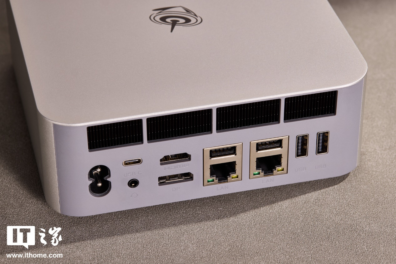 零刻 GTi12 UItra 背面接口较为丰富,自左至右依次是 AC 电源接口、雷电 4(40Gbps)、3.5mm 音频插孔(集成 CLR CMOS)、HDMI(4K60Hz)、DP1.4a(4K144Hz);为了提高空间利用率,零刻采用了 2 个 2.5G LAN+USB Type-A(10Gbps)接口的融合设计;最右侧则为 2 个 USB Type-A 10Gbps 接口。