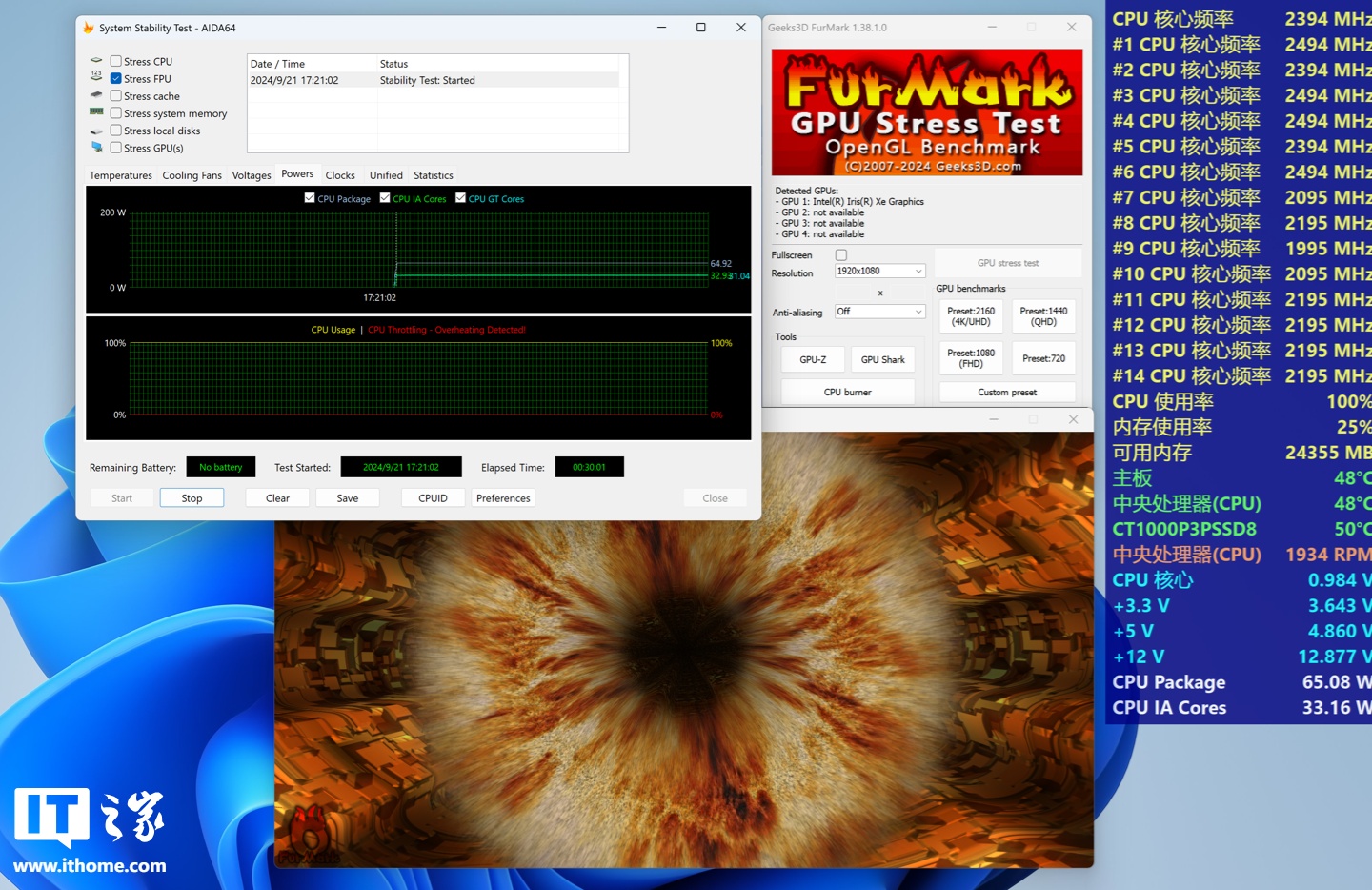 在不连接拓展坞仅使用主机的情况下进行双烤,零刻 GTi12 UItra 保证 65W 性能释放,这时 CPU 与 GPU 各占约一半功耗,确保在游戏时也能拥有足够的性能发挥。