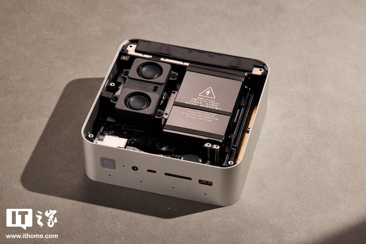 零刻 GTi12 UItra 内部左侧为 2 个扬声器,无需再外接音响设备;右边为内置的 145W 电源,意味着使用时不再需要外接巨大的电源适配器;最右侧则是用于连接 EX 扩展坞的 PCIe 接口。