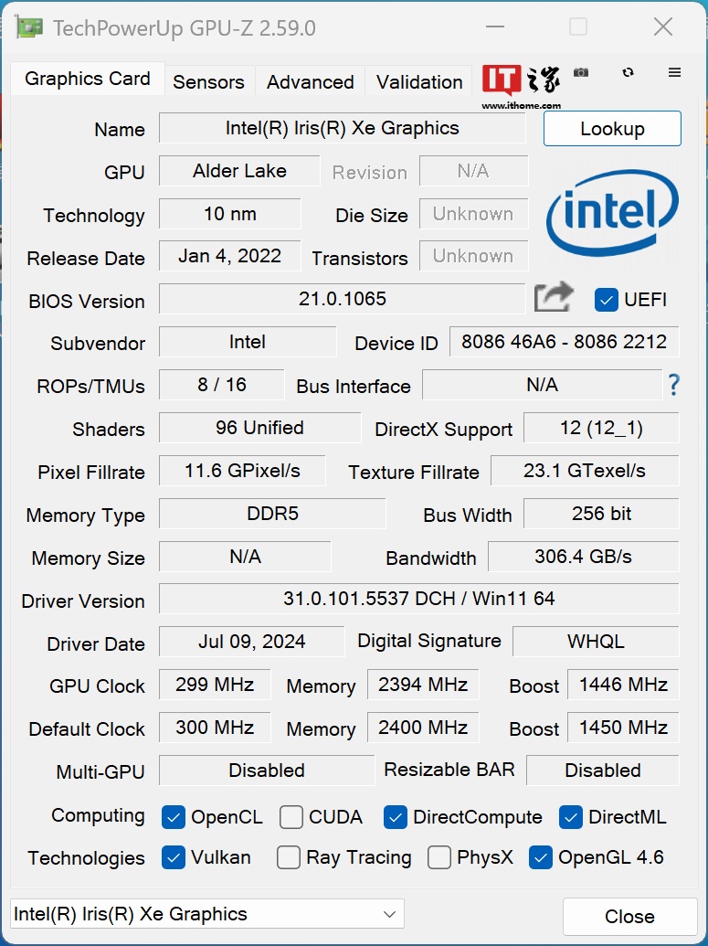 这颗处理器内置了英特尔锐炬 Xe 96EU 显卡,频率可达 1.45GHz,支持 AV1 视频解码。