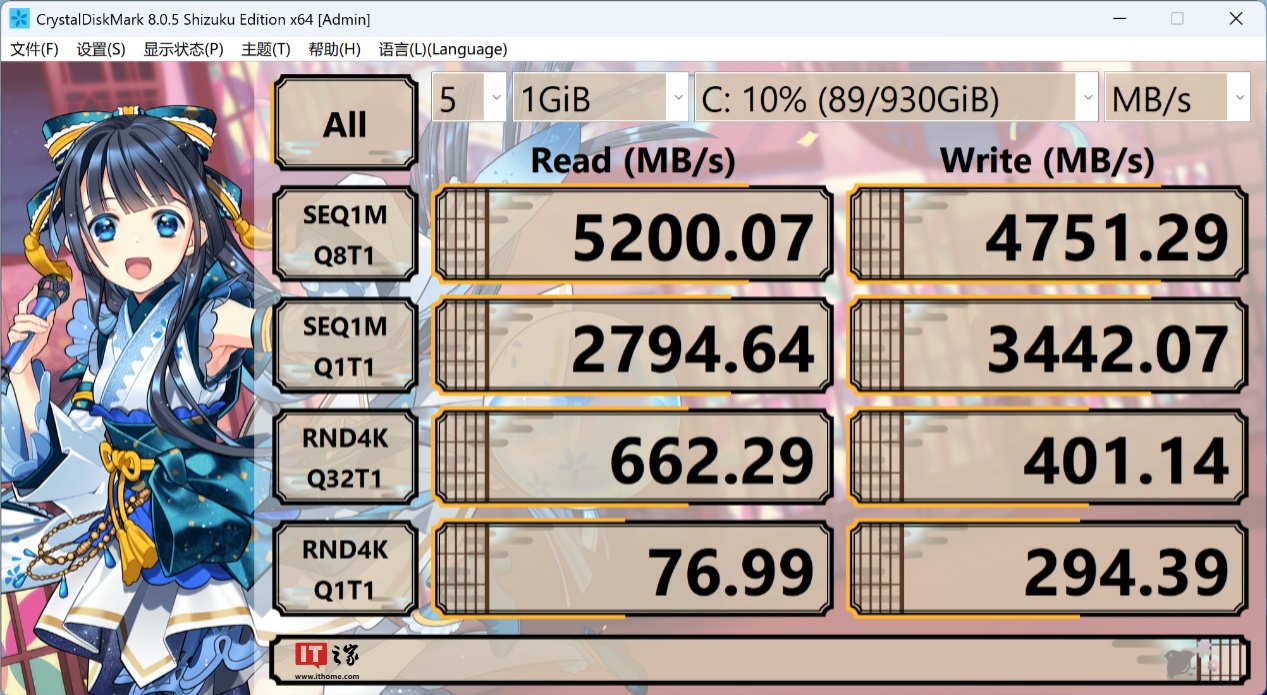 主机自带的硬盘型号为 CT1000P3PSSD8,也就是 Crucial 英睿达 P3 Plus,这是一块 PCIe 4.0 x4 硬盘;实测这款硬盘顺序读速度超 5200MB/s,写入速度超 4750MB/s,足以满足工作与游戏需求。