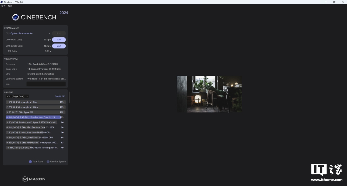 在 Cinebench 2024 跑分软件中,零刻 GTi12 UItra 单核成绩为 103 分,多核成绩 933 分;在 Cinebench R23 中单核成绩为 1737 分,多核成绩 15730 分。