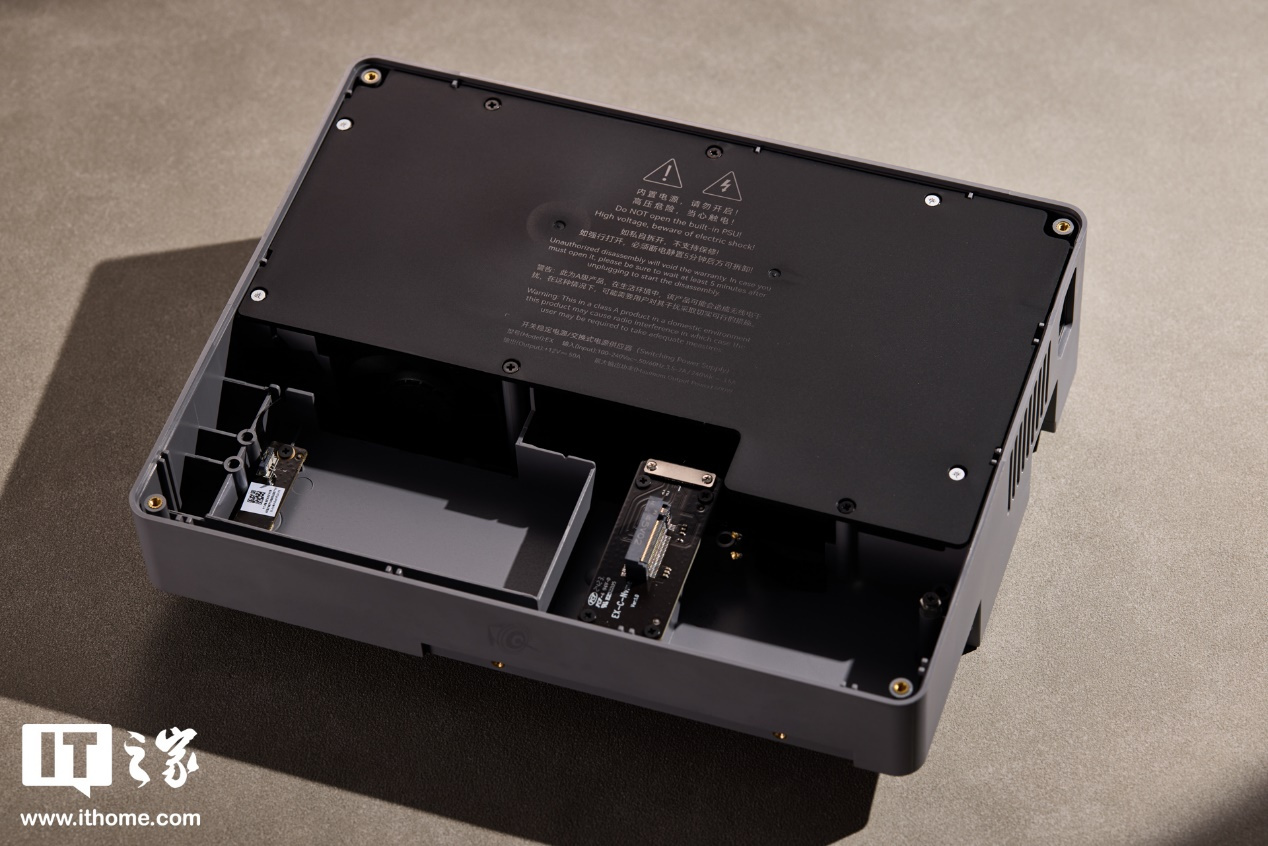 扩展坞的内置电源占据了绝大部分面积,下方为 M.2 硬盘位可供额外加装硬盘,还有预留给 Wi-Fi 的天线(加装硬盘与无线网卡为二选一设计)。