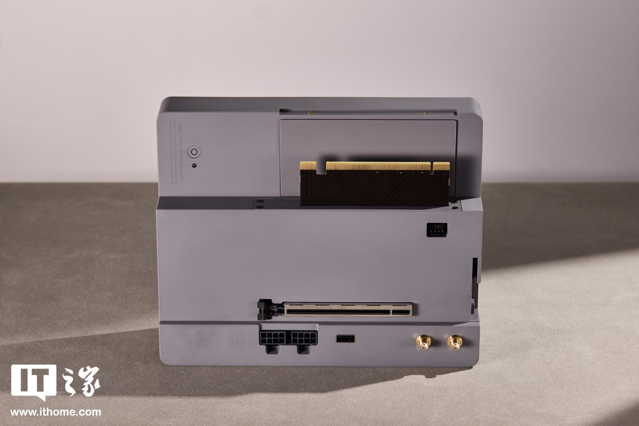 零刻 EX 扩展坞供电部分提供了双 8Pin,整机的电源规格是 600W;还有一个 USB2.0 接口;侧边附有 2 个天线接口,可以加装一个无线网卡或将主机内的无线网卡移动至此,使用外部天线理论上无线网络信号会有所加强。