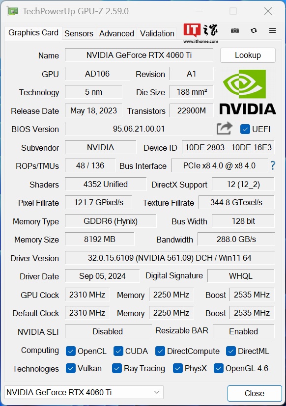 接下来我们连接独立显卡,进行更进一步的跑分测试,打开 GPU-Z 可以看到显卡已经成功跑在 PCIe Gen4 x8 的满速规格上。