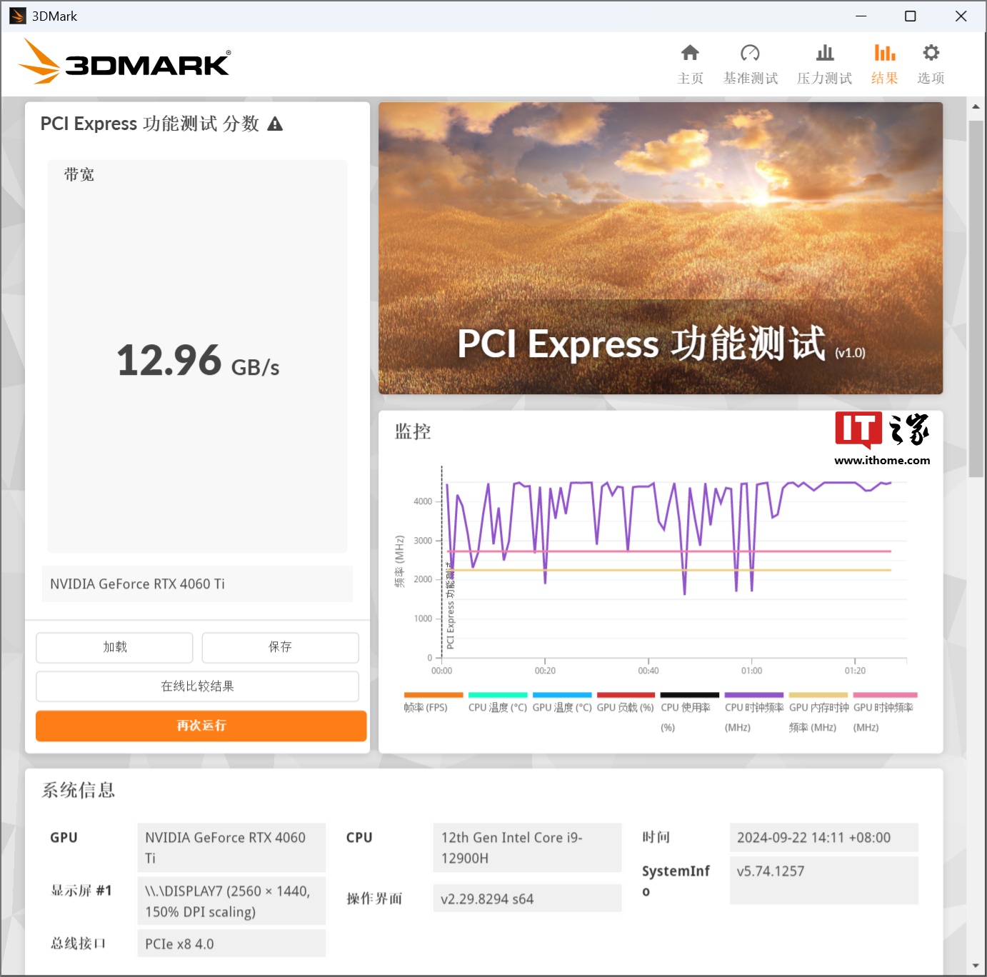 在 3DMark PCI-Express 功能测试中,RTX4060 Ti 带宽达到 12.48GB/s。