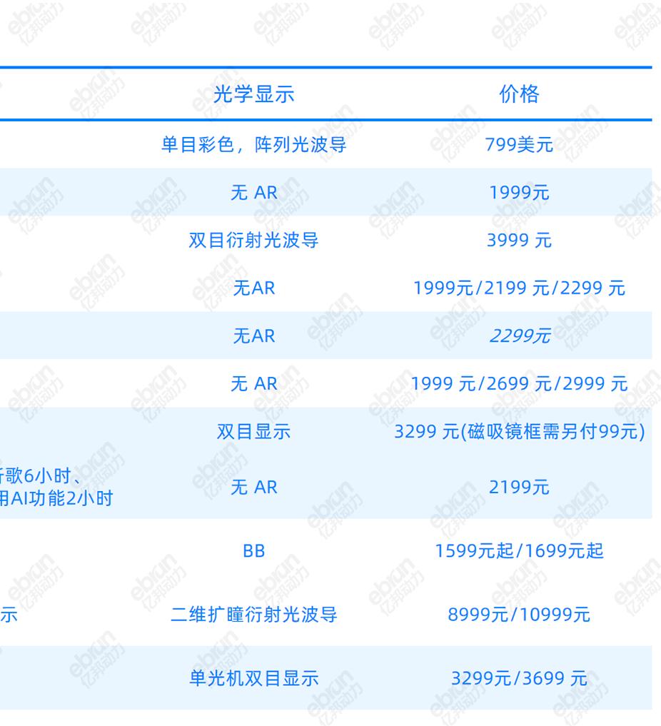 这些眼镜外观类似普通黑框眼镜,重量在39克~50克之间,比近视眼镜(20g-25g)略重,普遍配有摄像头、麦克风、扬声器,搭载大模型和AI助手,可以录音录像、拍照识物,续航6h-8h。价格则500-8000元不等,有无AR设备成为价格分水岭,无AR的AI眼镜价格在500-2000元不等,单目AR眼镜价格2000元以上,双目AR眼镜价格3000元以上。