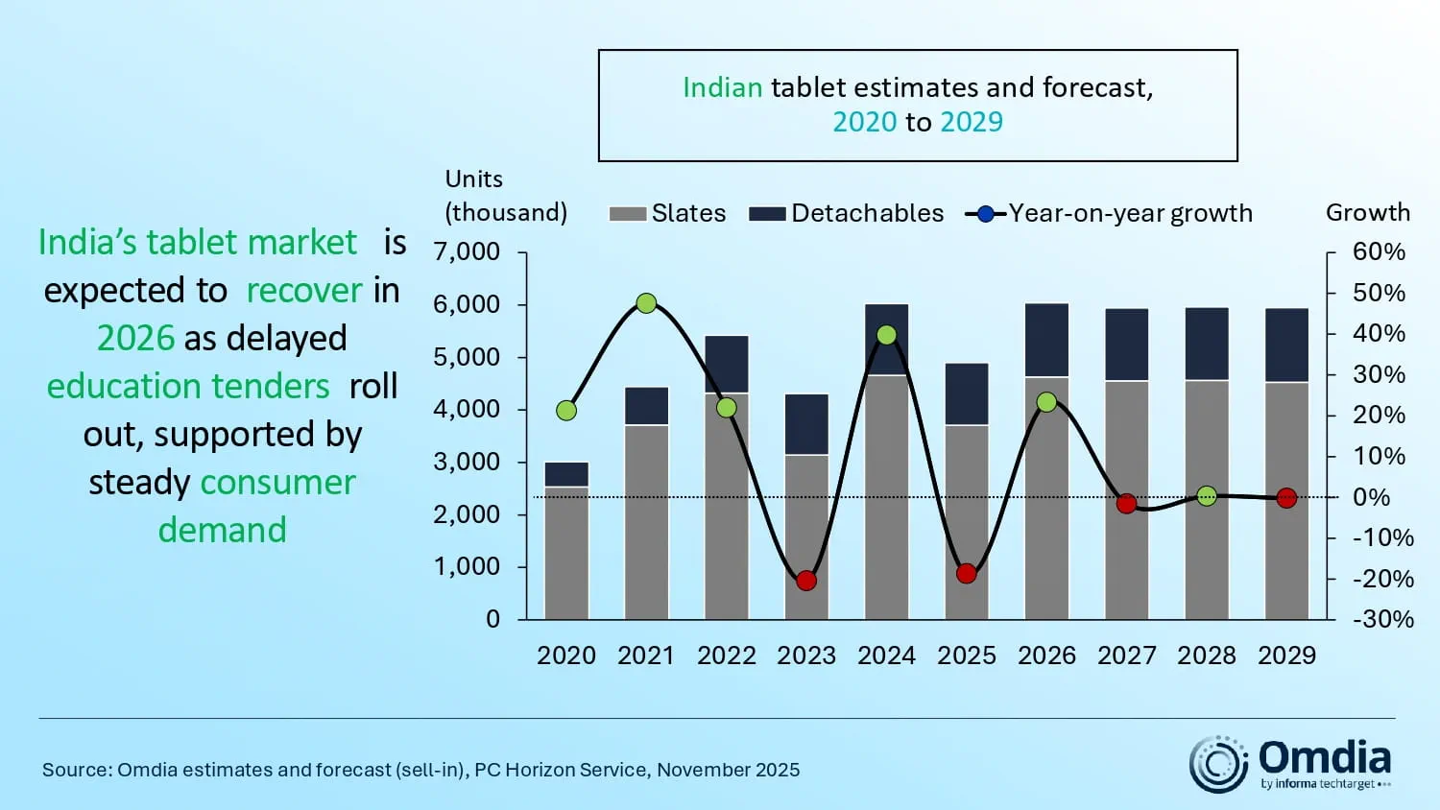 与 PC 市场的火热形成鲜明对比,印度平板电脑市场遭遇寒冬,出货量同比收缩 19% 至 160 万台。尽管消费级平板因娱乐需求增长了 14%,但政府主导的大规模教育项目延期,导致整体平板市场大幅下滑。