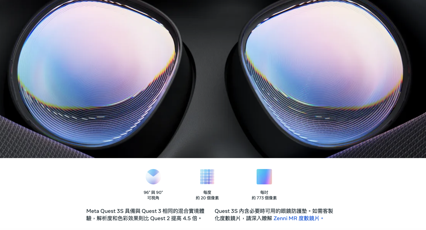 相比标准版 Quest 3 头显的 2064x2208 单眼分辨率,这款 Quest 3S 头显采用 Quest 2 同款 1832 x 1920 单眼分辨率(PPI 773)120Hz 面板(覆盖 100% sRGB 色域),配备菲涅耳镜片,可视角度(FOV)为 96° x 90°。