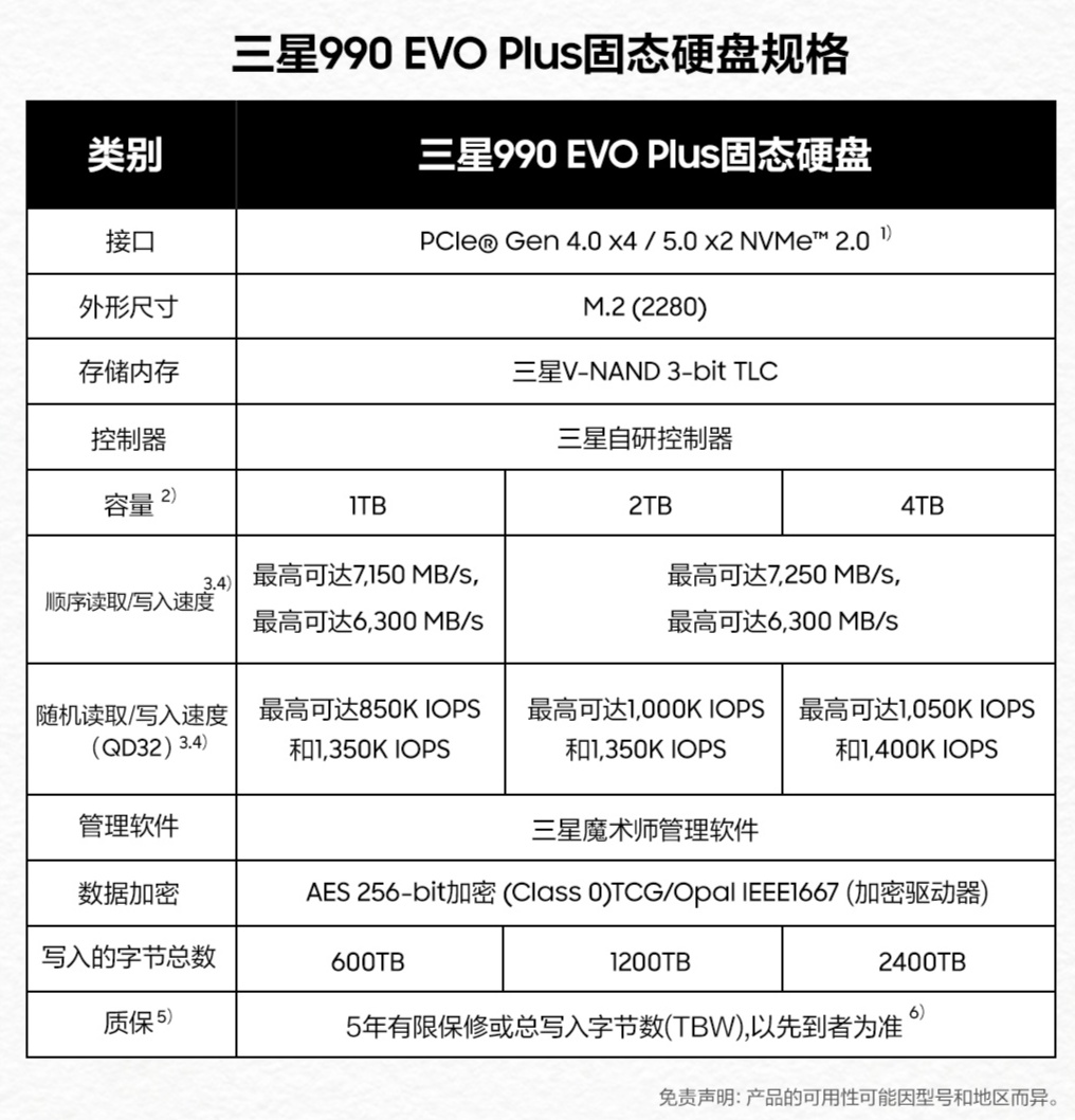 三星 990 EVO Plus 采用 3-bit TLC 颗粒,提供了 1TB、2TB 和 4TB 版本选择,相比 990 EVO 实现进一步提升。