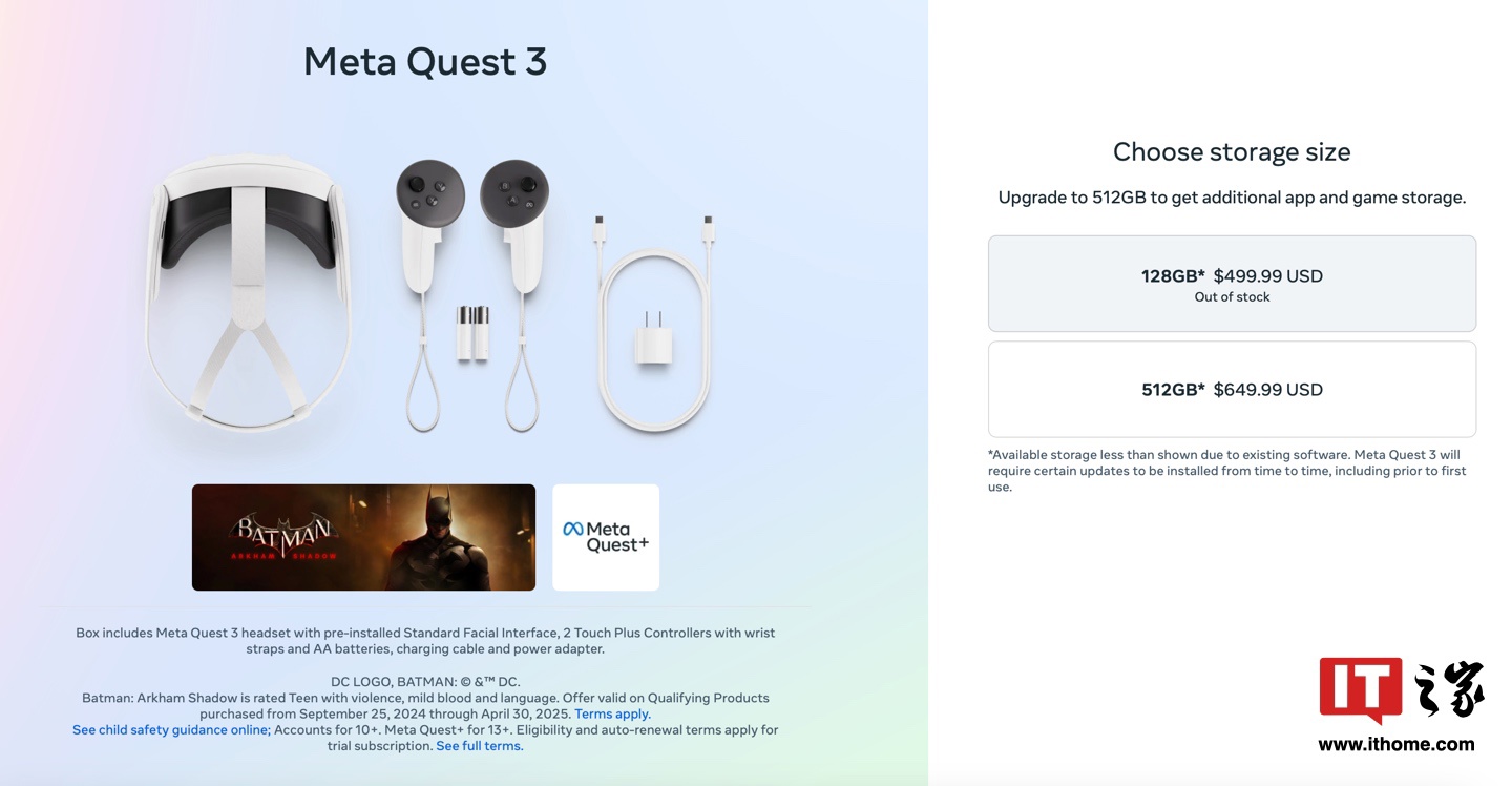IT之家 9 月 26 日消息,Meta 公司在 Connect 2024 活动中发布 Quest 3S 头显后,目前 Quest 2 头显已在全球市场下架、Quest 3 头显 128GB 版本在北美市场停售(IT之家注:128GB 版本在港 / 台官网暂时依然可以购买),IT之家附现有 Quest 产品线阵容如下: