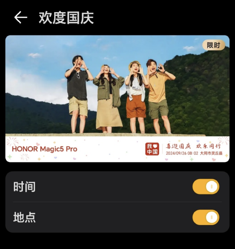 IT之家获悉,本次荣耀手机共上架“75 周年国庆”、“欢度国庆”两款限时水印,水印中可配置拍摄时间、拍摄位置,不过没有收录相机快门、焦段、ISO 等数据。