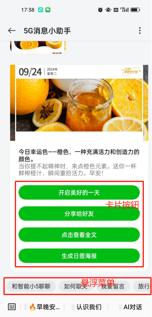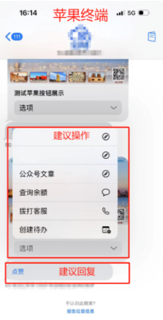 IT之家测试,安卓终端的卡片按钮内嵌在卡片中,悬浮菜单则在文字输入框上方横向分布,不管是卡片按钮还是悬浮菜单,都可以配置为“建议操作”(点击后跳转链接、打电话等操作)或“建议回复”(点击后自动回复一条上行消息)。