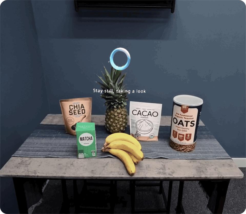 在实机体验中,The Verge 用 Orion 快速识别、标注了桌上放着的食材,并让 Meta AI 根据这些材料生成了一个奶昔的食谱。
