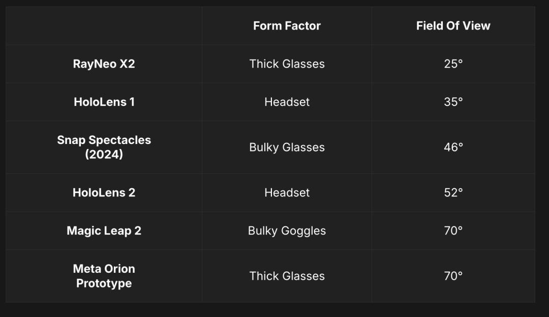 与业内常见波导类的AR眼镜相比,Orion用材相当舍得。其中,最为惊艳的是超大视场角,这也是Meta堆料展现了AR眼镜天花板。不过,从现有视频显示来看,似乎仍然出现掉帧、显示不清晰等情况。