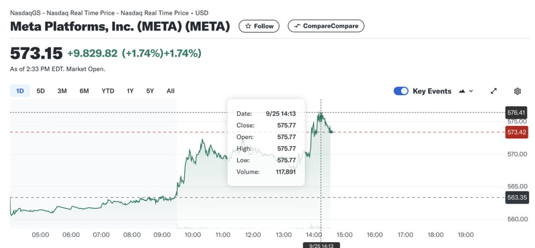 发布会结束后Meta股价一路上涨,截止发稿前,最高点涨至575.77美元/股。