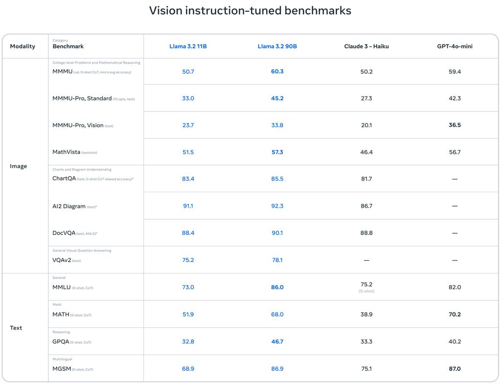 90B和11B视觉模型是其相应文本模型的直接替代品,同时在图像理解任务上的表现优于封闭模型,如Claude 3 Haiku、GPT-4o mini。