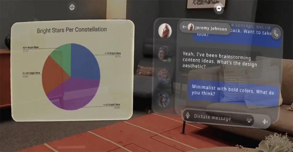 扎克伯格称它是“世界上从未有过的高端眼镜”,“技术上很疯狂”,在不同照明条件下,大到能显示一个电影屏幕或多个显示屏幕,覆盖物理世界全息图。