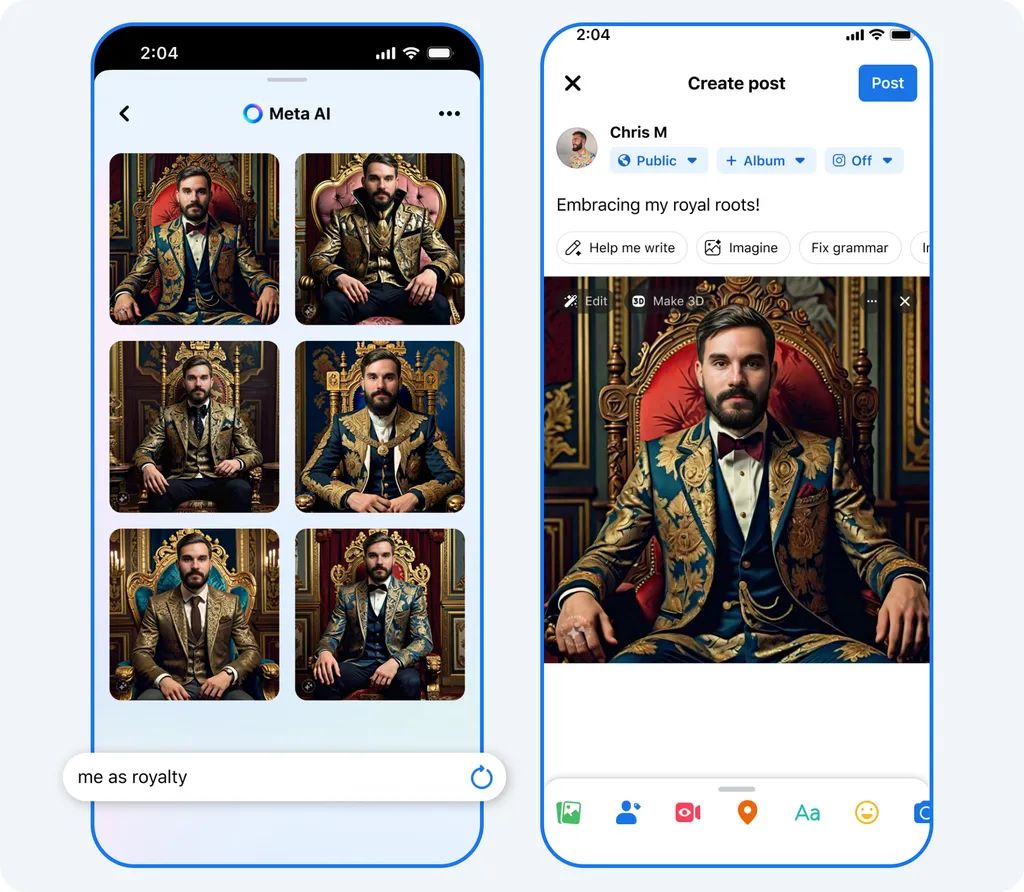 Meta AI的图像生成功能还能帮用户在Facebook等平台上为自己“立人设”,如将自己的个人资料图片更换为超级英雄或者其他角色,还能为故事推荐标题。