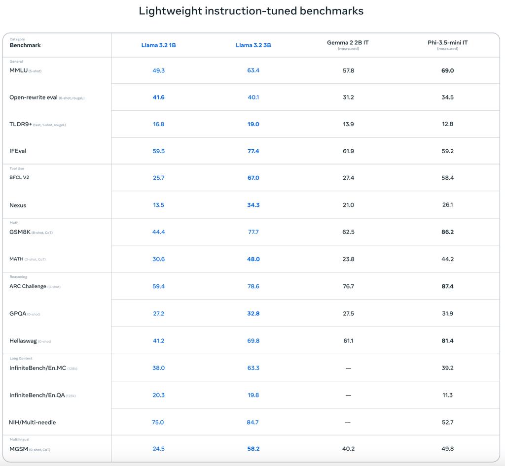 3B模型在遵循指令、总结、快速重写和工具使用等任务上的表现优于Gemma 2 2.6B、Phi 3.5-mini模型。1B模型的表现媲美Gemma。