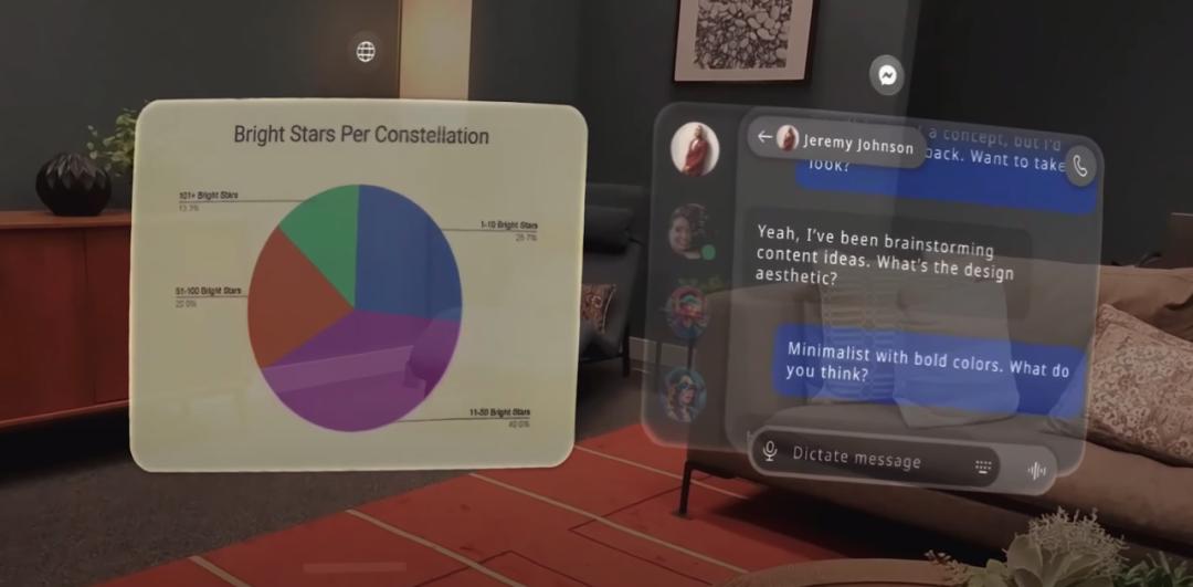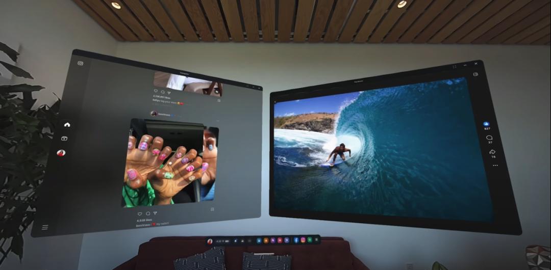 Quest 3S 可以实现 Windows 桌面的投射,实现多屏办公。以空间界面和交互(不同于二维)的角度重新思考,比如在 Instagram 等软件上的社交体验;扎克伯格展示了一个叫做“Hyperscape”的应用,用户在扫描一间真实房间并在头显里重建后,可以邀请别人来“做客”。