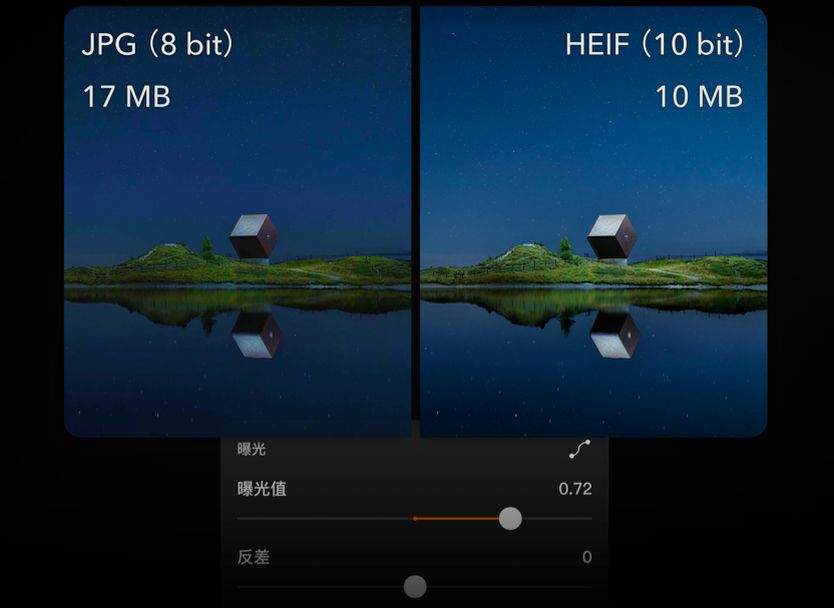 可获得与 RAW 格式同等完整的编辑支持,高光、阴影、清晰度均可在 HEIF 上调整。更高的色深,使 HEIF 格式的效果更接近 RAW。