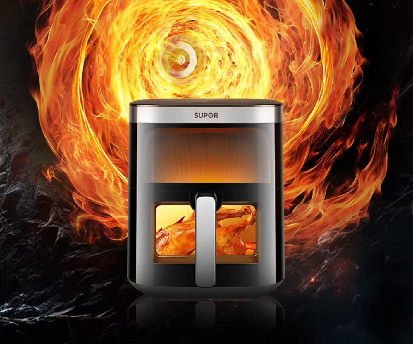 前面提到关于食材需要手动翻面的问题,九阳、美的、苏泊尔均推出了重新设计风道结构的新品,相比起传统的版本,新的设计能让锅腔内部形成更流畅的环绕式热风,绝大多数食材都不需要再手动翻面。另外,在它们的带领下,如今可视化设计的空气炸锅已经占据品类市场份额一半以上。