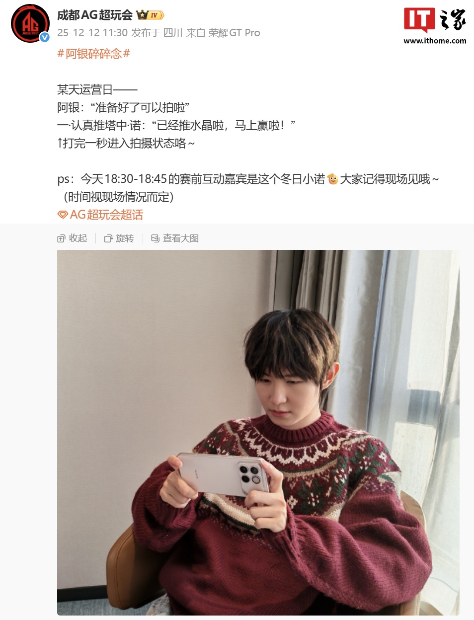 IT之家 12 月 12 日消息,继昨晚荣耀 WIN 系列新机草图曝光后,成都 AG 超玩会今日直接曝光了真机图:一诺手持新机,有望继续参与荣耀 WIN 系列手机的性能联调。