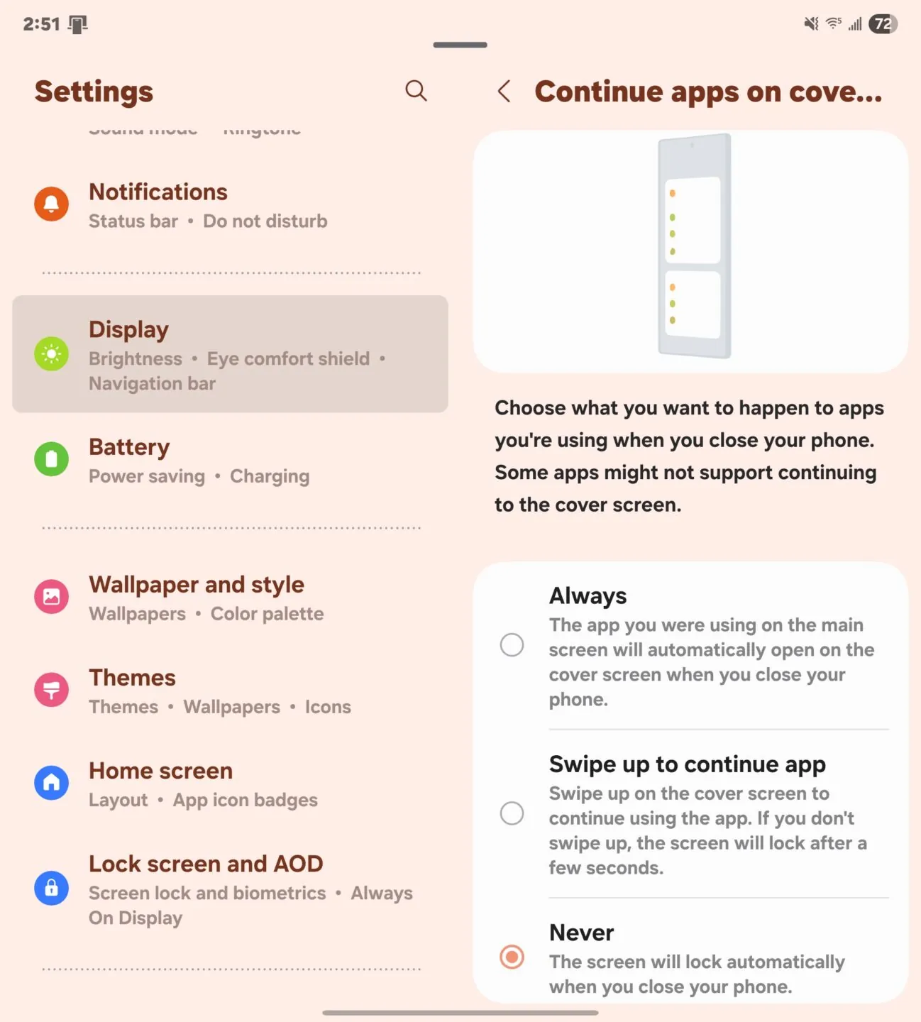 与三星传统的书本式折叠屏手机不同,Galaxy Z TriFold 在展开后默认会启动“One UI 主屏幕”,而非自动流转当前应用,用户需进入“设置 > 显示 > 在主屏幕上继续使用应用程序”手动更改此行为。