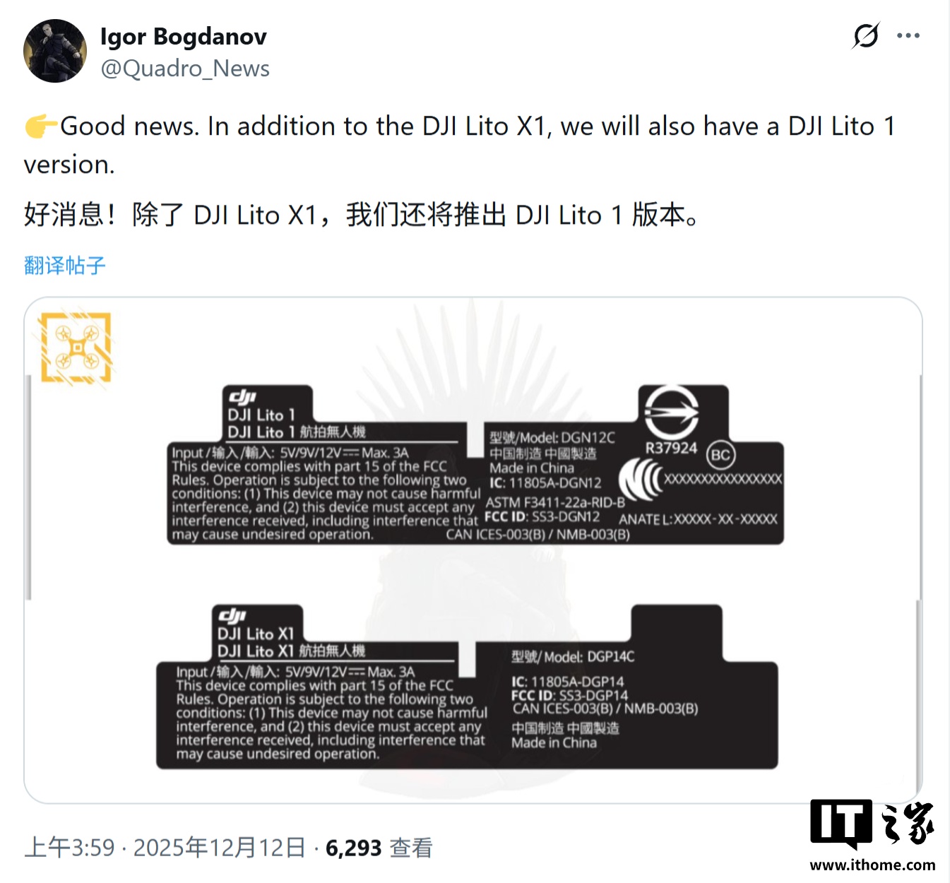 IT之家 12 月 13 日消息,消息源 @Quadro_News 昨日(12 月 12 日)在 X 平台发布推文,爆料称基于美国联邦通信委员会(FCC)数据,大疆 Lito 系列无人机浮出水面,包含 Lito 1 和 Lito X1 两款机型。