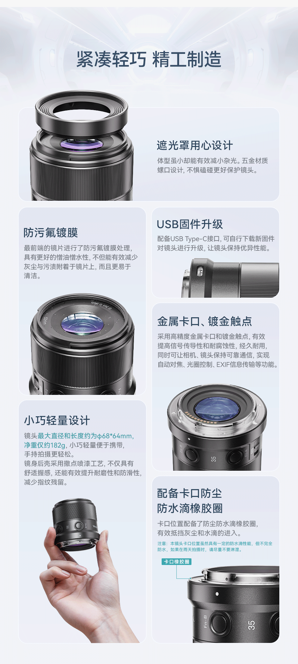这款镜头设计小巧,最大直径和长度约为 φ68*64mm,净重约 182g,还搭配双 FN 多功能键,IT之家附参数详情: