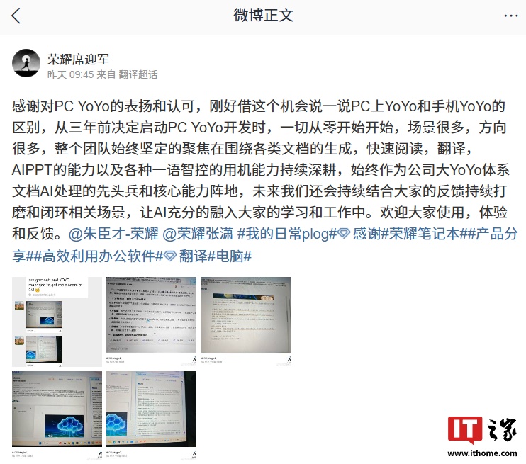 IT之家 12 月 14 日消息,荣耀全场景软件主理人席迎军昨日发文解释了 PC 上 YOYO 和手机 YOYO 的区别。他表示,从三年前决定启动 PC YOYO 开发时,一切从零开始、场景很多、方向很多。
