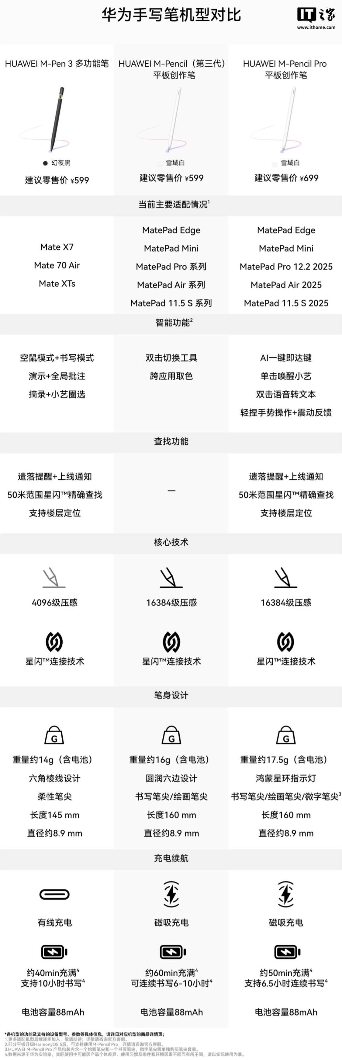 IT之家注意到,沿用了六年“手写笔”之名的 M-Pencil 系列现迎来改名,华为官网显示,目前在售的 M-Pencil(第三代)、M-Pencil Pro 均定名为“平板创作笔”。