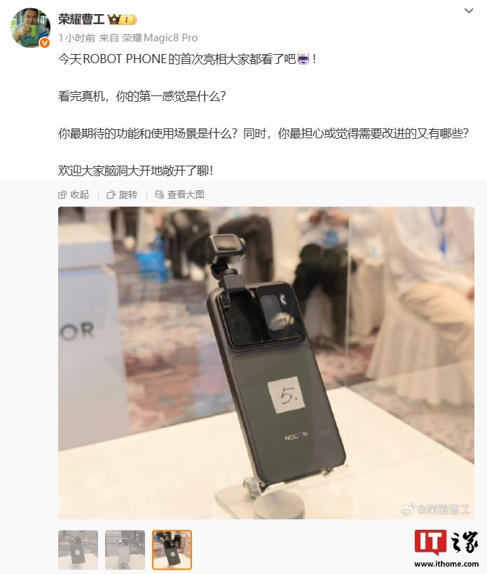 同时,荣耀也在今年 10 月晒出了一台名为“ROBOT PHONE”的概念手机,机身顶部配备一枚伸出式摄像头,自带云台,主打“AI 场景 +Pocket”,拥有生产力定制优化,可满足直播 / 创作需求。